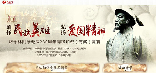 “缅怀民族英雄 弘扬爱国精神――纪念林则徐诞辰230周年网络知识(有奖)竞赛活动”自7月6日起,在人民网、福州新闻网和微信上同步上线,网友通过相应网络端口答题,截至7月12日晚20: 00,共有3683人次参与竞答活动(人民网2752人次, 福州新闻网931人次)。