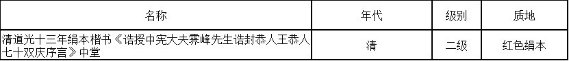 清道光十三年绢本楷书《诰授中宪大夫霁峰先生诰封恭人王恭人七十双庆序言》中堂