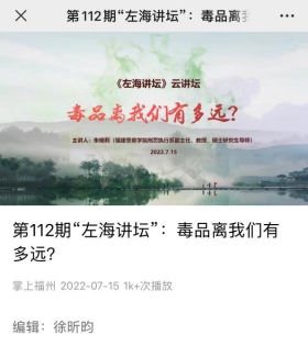 7月15日上午10点,本期讲座在福州新闻网、“掌上福州”APP线上播出,吸引了众多网络观众的认真聆听,点击播放量达300918次,线上线下齐发力,使大家增强识毒能力,加强防毒意识。